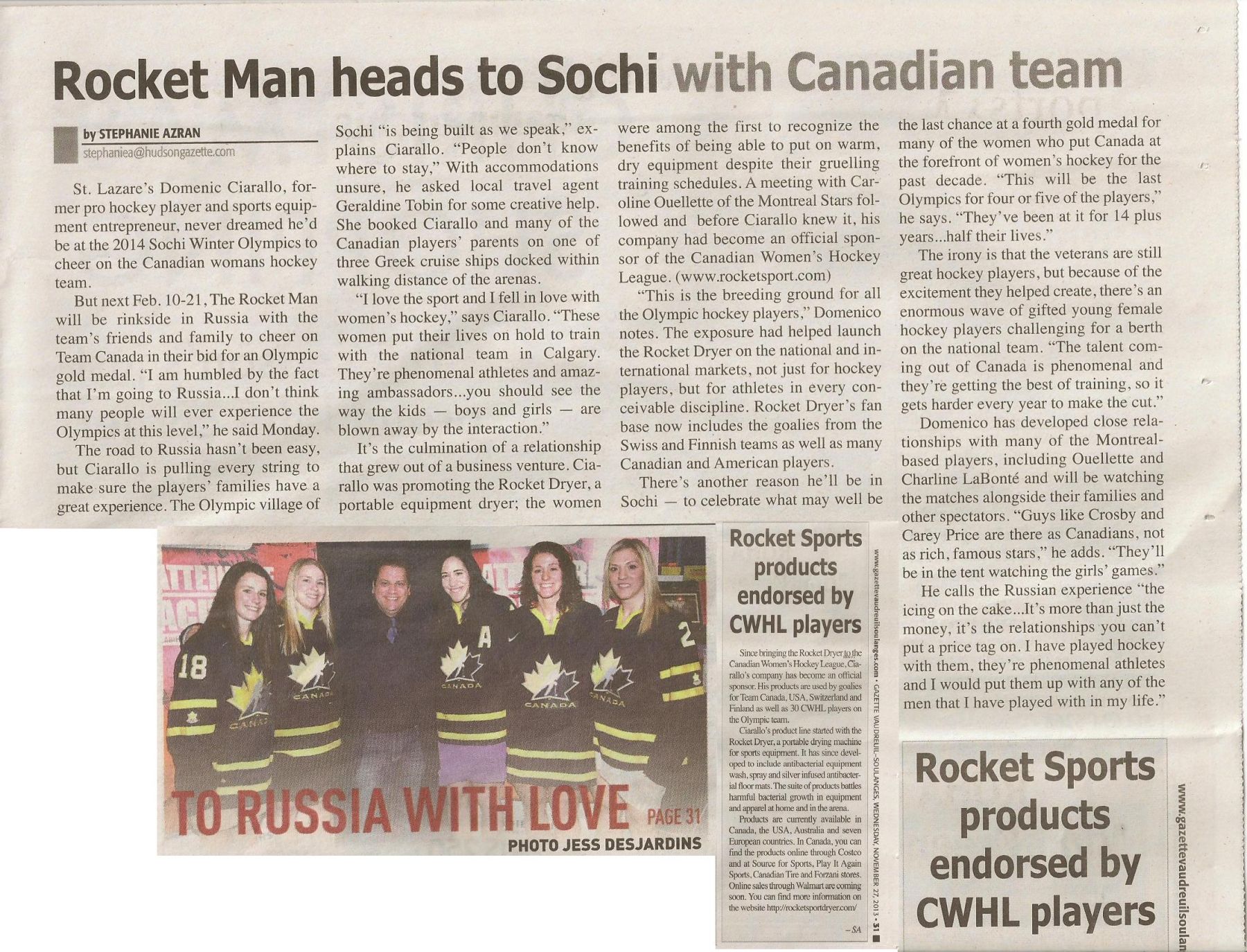 Hudson Gazette, November 27 , 2013. Domenico Ciarallo , ROCKET Man , CWHL, Team Canada and the Upcoming 2014 Sochi Olympics. How they story all comes together!